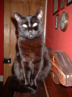 Hi there everybody I'm Mojo the black cat as you can see There are not too many around who look as majestic as me I will be two years old soon and I will live to a ripe old age I can possibly live for twenty odd years and become quite sage. Just don't let my looks fool you, I am certainly not very brave I love to take home mice I have caught for my family to save. I am rather nervous though but I feel quite safe with my family Although I look ready to pounce I really am a proper softie I love it when I can curl up with my owner on her soft snug bed As she settles down to sleep while cuddling and fondling my head.
